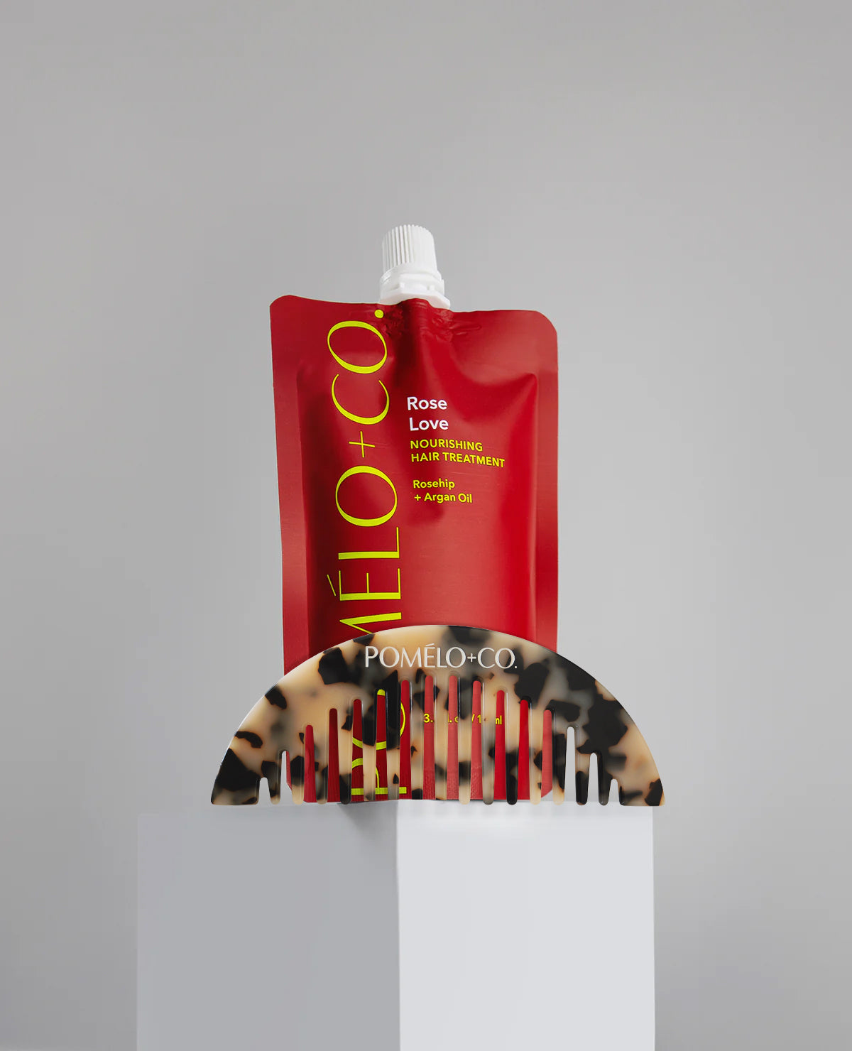 Maschera pre-shampoo con olio di argan e rosa e un pettine classico per capelli più lucenti.