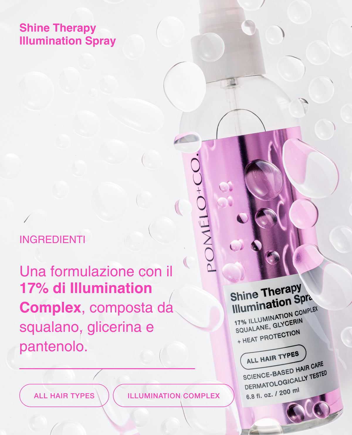 Spray Illuminante con 17 % di complesso illuminante, arricchito con squalano, glicerina e pantenolo, per capelli curati, idratati e morbidi, con protezione dal calore fino a 230 °C.